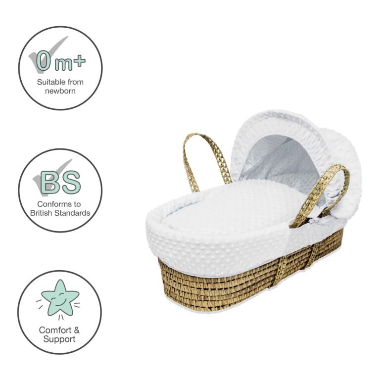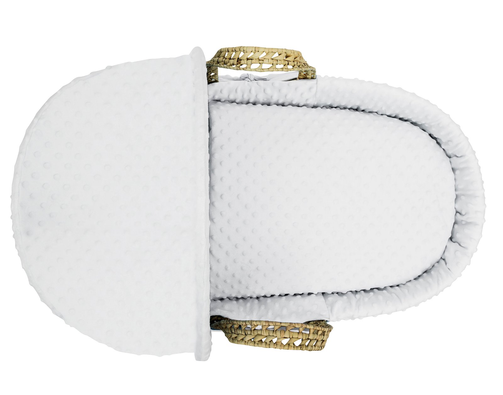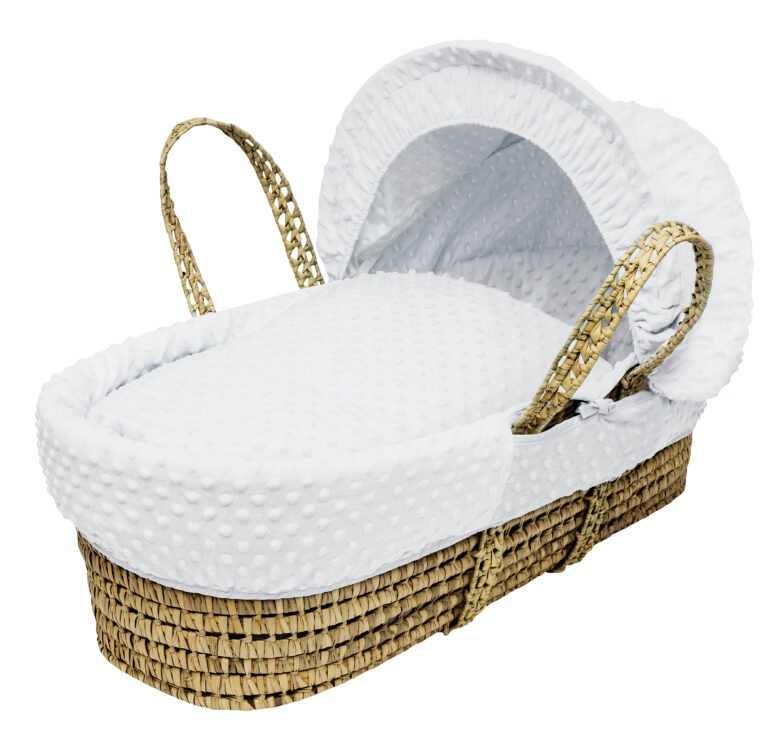Suitable from newborn, the Palm Moses Basket and Opal Folding Stand is the perfect starter bed for your little one and will send them to sleep in next to no time.This handmade palm Moses Basket and Stand features a cute, Unisex Printed Fabric design which will be a great edition for your nursery. The bedding and padded quilt are made from our luxury easy care Velboa fabric and has a soft full body surround for added protection and comfort. This Moses Basket also includes a comfortable mattress that you can be certain your baby will sleep peacefully at night on.The baby Moses Basket also has an adjustable hood, perfect to create a cosy sleeping space for your precious little one. The hood can be adjusted and tightened using the fasteners on either side. The mattress is water resistant and breathable allowing easy air movement and heat dissipation around your baby’s body keeping them cosy all night long. The mattress cover and bedding are also washable, just in case of any accidents.