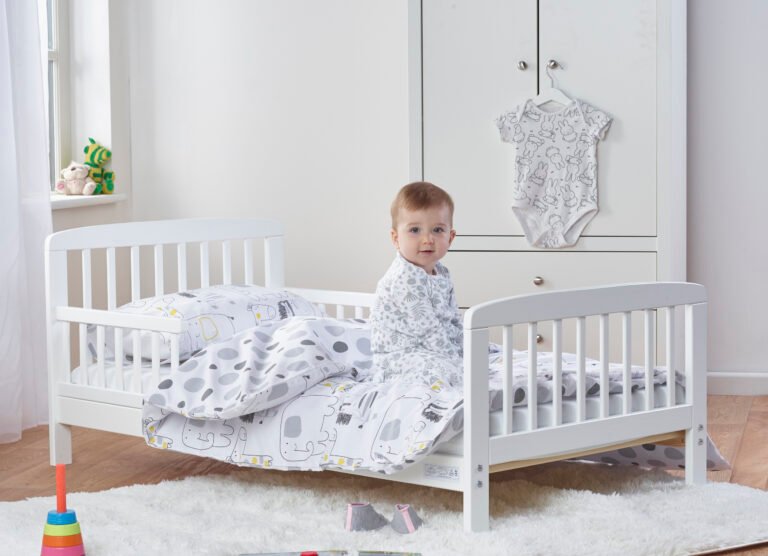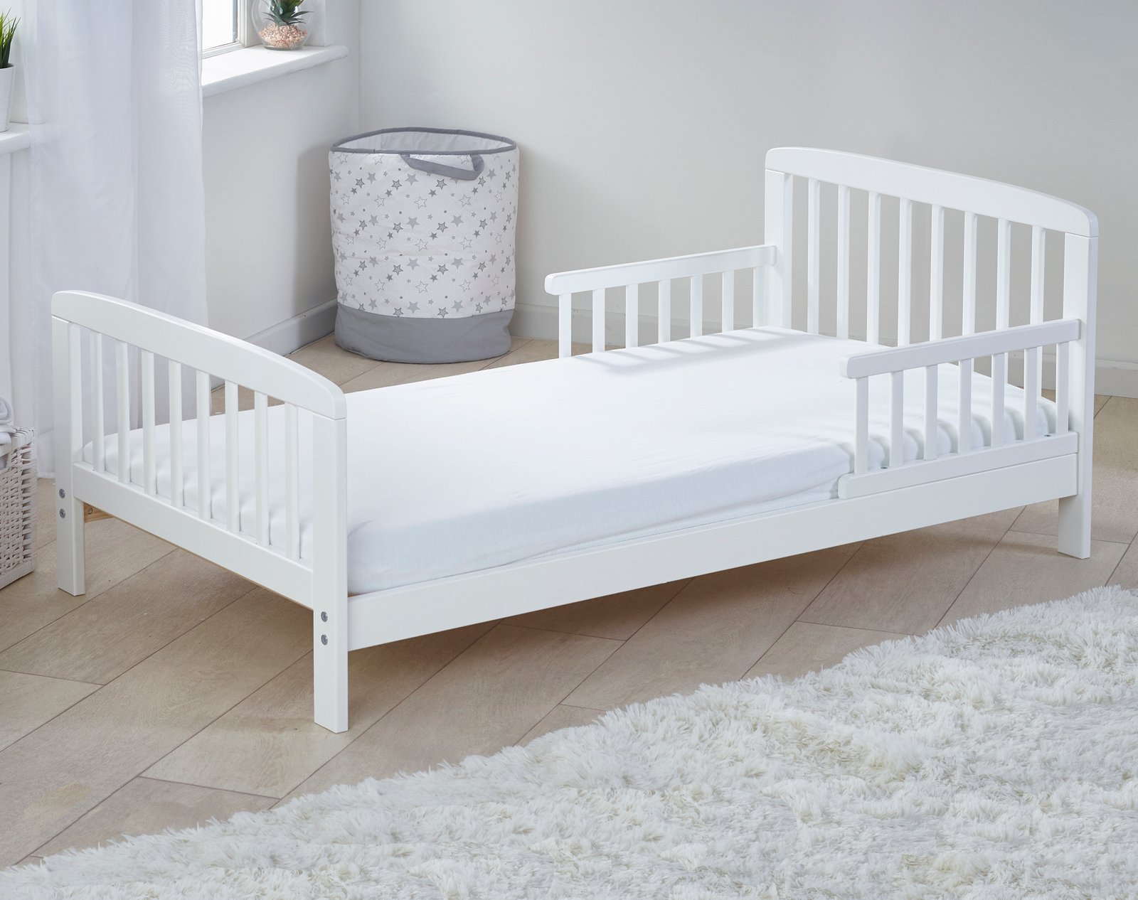A great transition between cot and adult bed, our Sydney Toddler Bed is low to the ground, making it easy to get in and out. It also has side support rails, which prevent falls. It has a painted finish to give a modern yet classic feel and is made from solid pine wood, creating a sturdy bed for your little one. It comes flat-packed but is easy to assemble and comes with all the fittings you need!. This toddler bed bundle is suitable from 18 months up to 4 years, so it’s perfect for children who have outgrown their cot and are looking for something a little bigger.