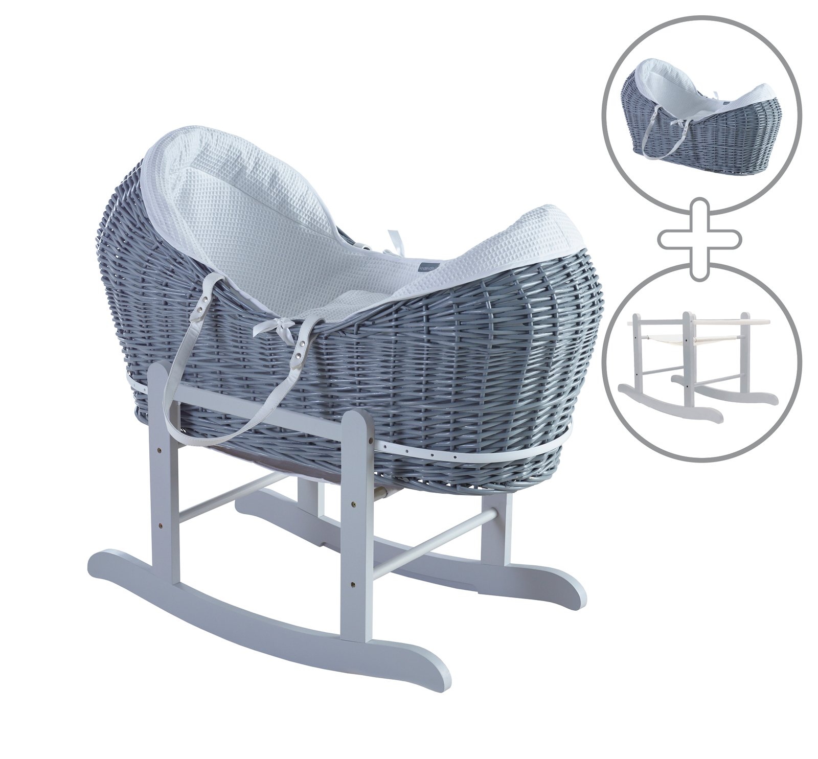 Suitable from newborn, the Kinder Valley White Waffle Grey Pod is a perfect starter bed for your little one. This handmade wicker pod basket comes with a soft padded dimple surround, an embroidered coverlet, and includes a comfortable mattress to create a cosy sleeping space for your precious little one. The mattress is water resistant and breathable, allowing easy air movement and heat dissipation around your baby’s body, keeping them cosy all night. The mattress is also washable. A good balance between comfort and style, our White Waffle Pod will ensure safe and sound sleeping for you and your baby. A Rocking Stand included.