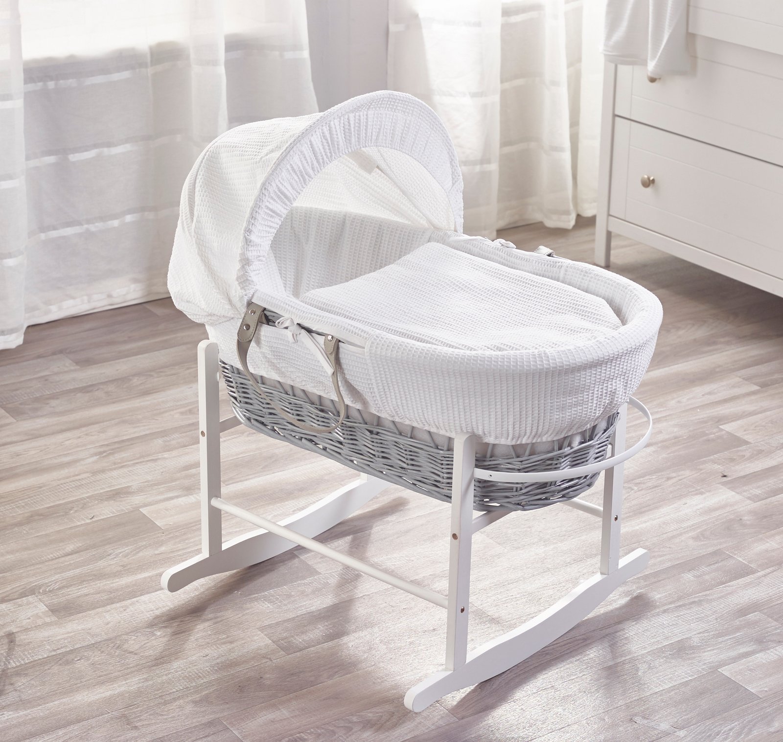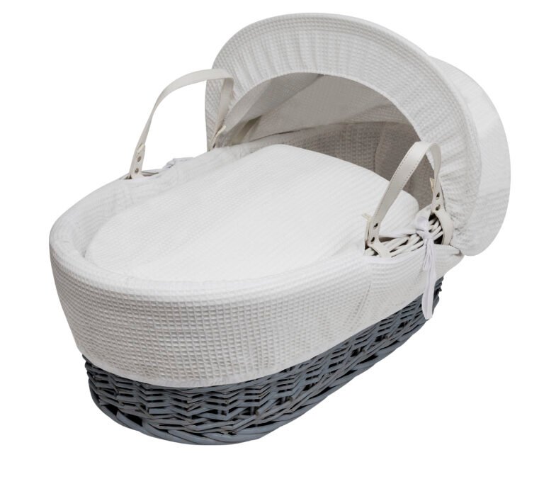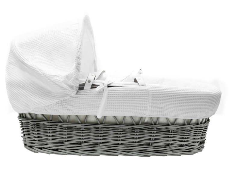 Suitable from new-born, this Wicker Moses Basket with a cute unisex design is a perfect starter bed for your little one. Made from our white 100% cotton bedding, which is easily washed and cared for. It has a comfy padded surround, includes a comfortable mattress and has an adjustable hood to create a cosy sleeping space for your precious little one. The Hood can be adjusted and tightened using the fasteners on either side. The mattress is water resistant and breathable, allowing easy air movement and heat dissipation around your baby’s body keeping them cosy all night long. The mattress is also washable, just in case of any little spillages! A good balance between comfort and style, our White Waffle Wicker Moses Basket will ensure safe and sound sleeping for you and your baby. Stand not included.This product should not be used as a carrycot. Under no circumstances should you carry your baby in the Moses basket. Handles are for easy portability of the Moses Basket only.